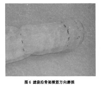 濾袋和骨架接觸部分長期由于脈沖噴吹導(dǎo)致接觸部分磨損,表現(xiàn)為很明顯的橫豎筋條方向磨損 痕跡。要注意濾袋和骨架的尺寸配合、骨架表面的光潔度等。
