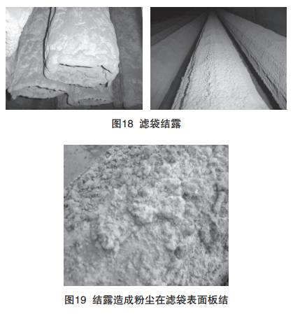 結(jié)露是袋式除塵器運行中好常見問題(如圖18), 水分是濾袋結(jié)露的好原因,造成濾袋含有水分的原因 通常是低溫發(fā)生凝露,尤其在處理燃燒或高溫煙氣時,當濾袋表面的初始粉塵層含有水分,干燥后就會使粉塵 凝結(jié)、板結(jié)(如圖19)。