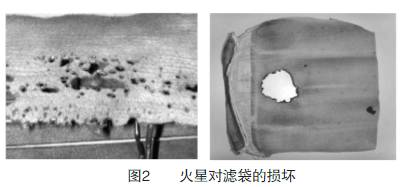 除了高溫燒毀外,煙氣中的火星對濾袋的損害也是非常嚴重的。如焦爐、干燥窯、鏈條爐、沖天爐、電爐、高爐、混鐵爐等在生產(chǎn)過程中會有大量的火星混入煙氣中,如對火星處理不及時,尤其是濾袋表面粉塵層較薄時,火星就會將濾袋燒穿,形成不規(guī)則的圓洞(如圖2)。但當濾袋表面粉塵層較厚時,火星不會將濾袋直接燒穿,而會造成濾袋表面形成深顏色的烘烤痕跡。