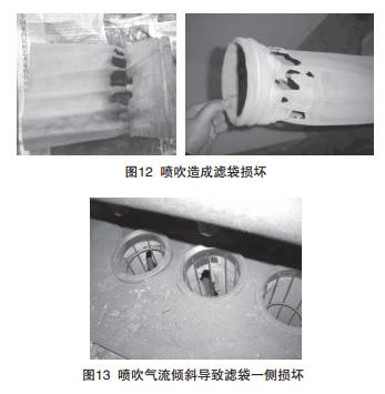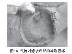 由于噴吹管內(nèi)的氣流為橫向運行,當導流管設(shè)置不 當時,產(chǎn)生的噴吹管氣流就不是垂直而是傾斜向下噴入 濾袋,就會造成袋口部位下方約300mm處產(chǎn)生由內(nèi)向外 的破損(如圖12、13所示)。