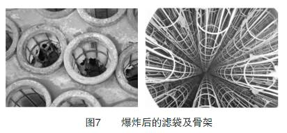 隨著袋式除塵器的普及,袋式除塵器粉塵爆炸事故也呈上升趨勢。如上海某鋼廠的干熄焦除塵系統(tǒng),由于前部阻火墻制造的問題,造成火星進入除塵器內(nèi)從而引起爆炸,將除塵器進口管道盲板炸出幾十米遠,除塵器箱體嚴重變形。又如沈陽某機制炭廠,由于鋸末在炭化過程中產(chǎn)生大量的焦油和碳氫化合物等易燃、易爆物質(zhì),而且焦油粘在濾袋上隨著時間推移越積越多,當有火星進入除塵器后就引起了除塵器爆炸。除塵器爆炸瞬間所產(chǎn)生的能量可使花板嚴重變形,濾袋爆裂情況見圖7。