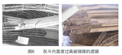 高溫粉塵被收入灰斗后,如果不能及時排出,粉塵會長期蓄積在灰斗里造成灰斗內(nèi)溫度不斷升高,濾袋長期在高溫烘烤下就會變脆、變硬,嚴重時則會燒毀,尤其是粉塵中含有的易燃物質(zhì),會在灰斗內(nèi)燃燒,從而燒毀濾袋(如圖6)。