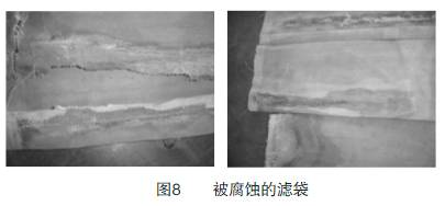 水解痕跡為顏色混濁,濾袋強度嚴重下降,易破損。縫紉線發(fā)生水解后,濾袋從縫紉線處開裂,使濾袋不再是筒狀。濾袋縫紉線斷裂如圖9。