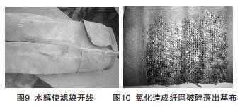 纖維氧化是纖維中分子失去(或離解)電子的過程,如PPS纖維,在高溫(150℃)條件下氧分子攻擊分 子中的“S”,并與之結(jié)合。造成PPS纖維變色、變硬、 變脆,強度降低而破損,嚴重時纖網(wǎng)會破碎而脫離基布 (如圖10)。氧化是濾袋損壞的又一主要因素。抗氧化 性能較差的濾料主要有:聚丙烯、聚苯硫醚(PPS)等。