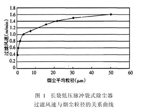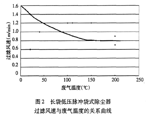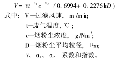由此可見,脈沖清灰袋式除塵器過濾風(fēng)速與廢氣溫度和廢氣中的煙粉塵濃度成反比,與煙粉塵粒徑的對數(shù)成正比。