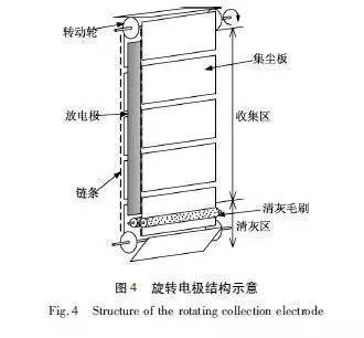 旋轉(zhuǎn)電極式電除塵器與常規(guī)電除塵器的除塵原理完全相同,在清灰方式上有很大改變。旋轉(zhuǎn)電極是由若干個(gè)小塊極板固定在板鏈上低速旋轉(zhuǎn),極板由原來(lái)的整體壓型板改為小塊極板,通過(guò)板鏈帶動(dòng)旋轉(zhuǎn)。其清灰方式采用旋轉(zhuǎn)鋼刷清灰,從根本上改變了常規(guī)電除塵器的振打裝置清灰,徹底避免了振打清灰造成的二次揚(yáng)塵,同時(shí)也解決了高比電阻粉塵的“反電暈”問(wèn)題]。