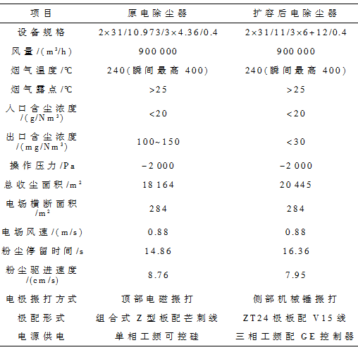 窯頭電除塵器具體規(guī)格型號(hào)按照魯奇型除塵器的規(guī)格表示方法折算后為:窯頭規(guī)格:2×31/10.973/3×4.36/0.4 m,改造后規(guī)格:2×31/11/3×6+12/0.4 m。